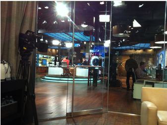 The “green room” was behind a large glass wall directly on the set.  The upcoming guests literally are watching the proceedings 10 feet away from the anchors. Pretty cool. It provided the illusion that you were right in the middle of the set.