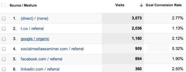 The goal set up in this report is related to getting email subscribers.  From the image above you see that there is a 2.50% conversion rates from LinkedIn and 1.90% from Facebook.  This gives you a goal to achieve higher on both channels.