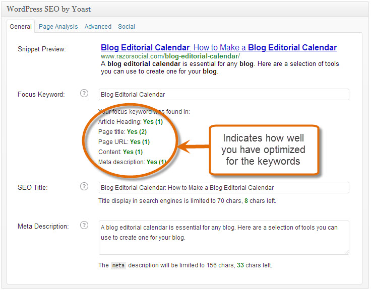 Using this plugin you specify the focus keywords you want Google to rank you on and then it then gives an indicator where these keywords are mentioned in the post in areas that are relevant for Google.