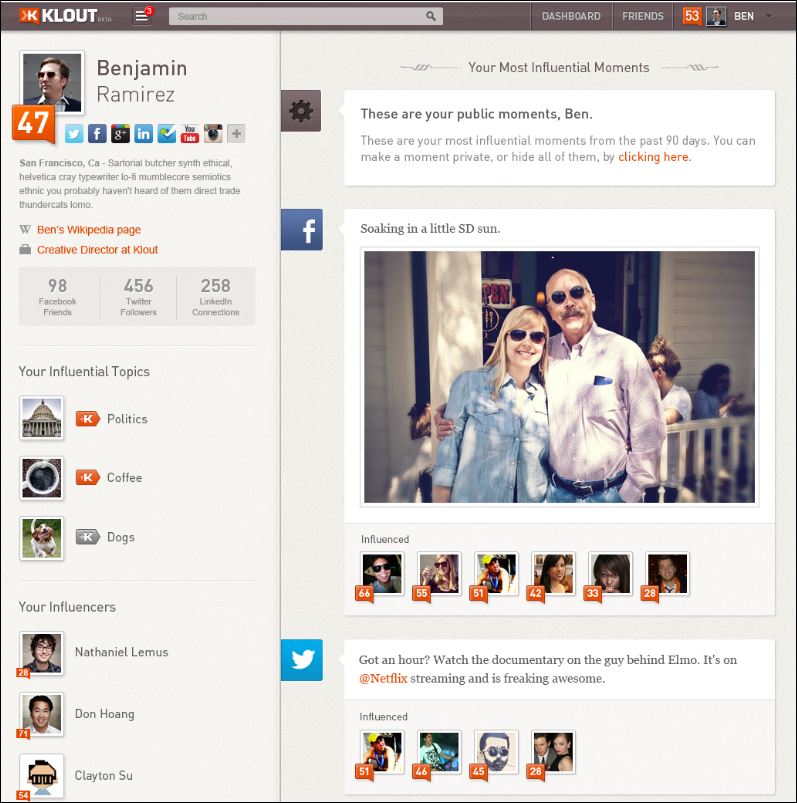 - On “transparency” they seem to have stepped up to requests with the “Moments” feature, although Kred appears to still provide more detail in this area. If you have the time to study it, this feature is useful and provides insight into their algorithm. The company also provided a detailed list of factors that impact your Klout score.