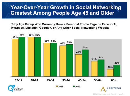 In data that my company (Edison Research) just released yesterday, we found that 54% of all Americans age 12 and over have a personal profile on Facebook. This represents some modest growth over last year’s 51%, but not hockey-stick growth, so one might be tempted to see Facebook’s rise as slowing down, especially when that growth is trended over the past five years.