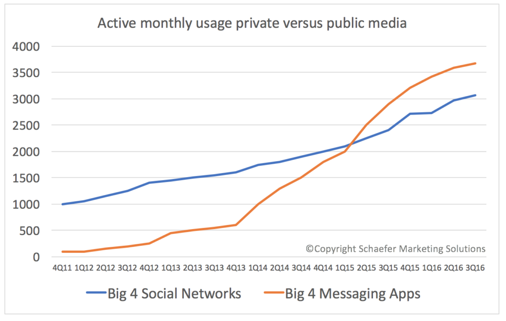 About a year ago I wrote a post about a milestone. For the first time in history the number of people active on private networks (like Messenger, WhatsApp and Snapchat) exceeded those using public social media platforms (like Facebook, Twitter and LinkedIn). Social media use is still growing too, but the rise of these private networks represents a profound shift for marketers.