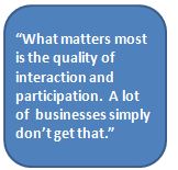 I don’t ever let myself get sidetracked by a desire to accumulate big numbers to impress people. The number of fans, followers and friends I have is essentially irrelevant to me.  What matters most is the quality of interaction and participation.  A lot of businesses simply don’t get that.