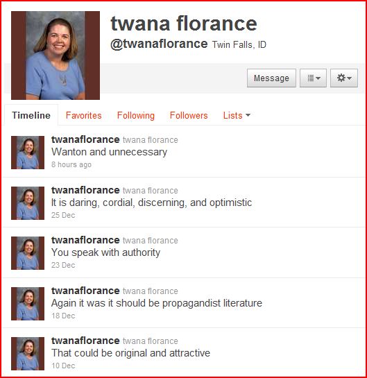 Judging by her school-issue personal photo, Twana Florance appears to be a mild-mannered, middle-aged matron from Twin Falls, Idaho. But there is no Twana Florance. Twana is probably some teenager in a Third World country hired to propagate and populate fake Twitter accounts that will later be sold on eBay.