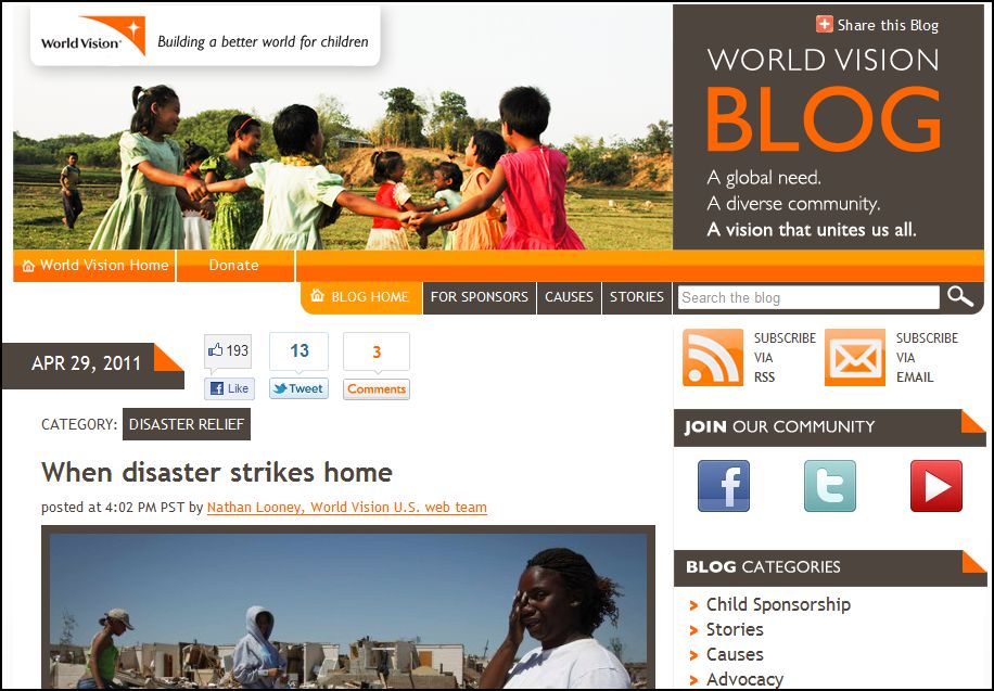 This blog just began in 2011 so we’ll have to check in later to see if they can sustain what is starting out to be an excellent blog.  World Vision works with impoverished children and their families throughout the world and is also effectively using eyewitness accounts to connect to constituents.