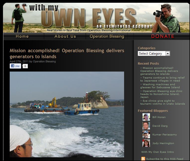 Check out this gutsy, effective blog.  With My Own Eyes is a firsthand, photo-journalism account offering users the opportunity to see some of the most devastated, disaster-ravaged and previously inaccessible places in the world, as well as a look at Operation Blessing’s efforts to help people that live there.