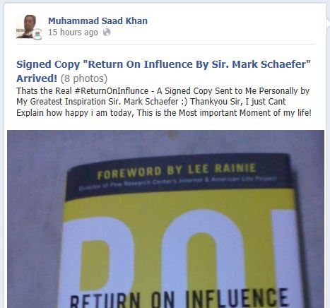 Through Twitter I have connected to hundreds of inspiring people from around the world but none perhaps as loyal and dedicated as a young man named Muhammad Saad Khan, who is using Twitter and the social web to learn about social media from his home in Karachi, Pakistan. This week he tweeted along to a U.S. Youth Forum broadcast from Korea. He could not obtain a copy of my book in Pakistan, so I sent him one. When he received the book, he made this Facebook post (along with six photos of the book):