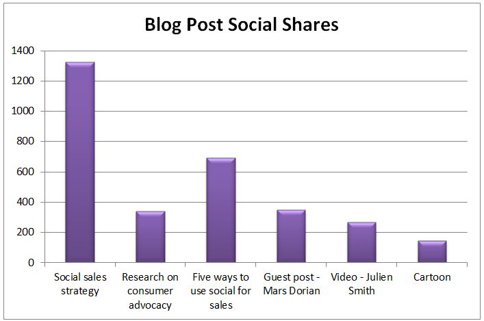 First let’s look at how the blog posts for the week performed in terms of social sharing (Total of Twitter, Facebook, LinkedIn and Google+):